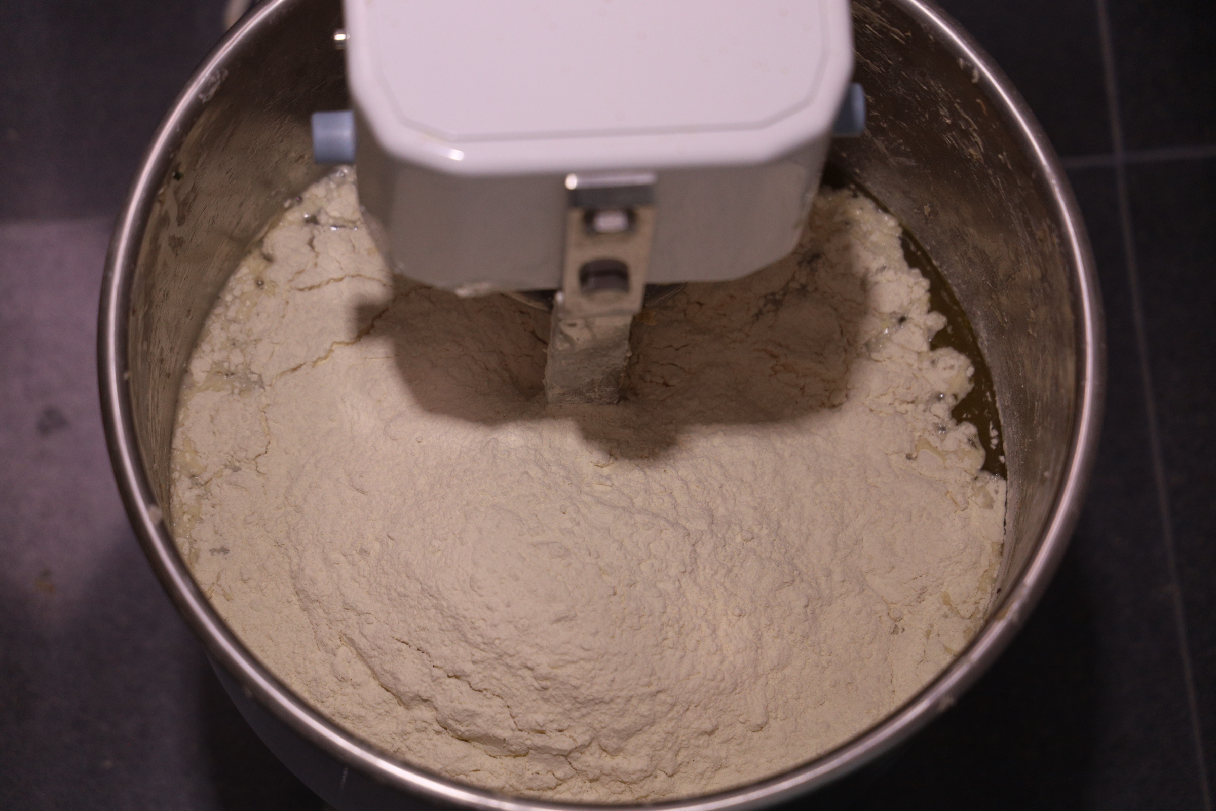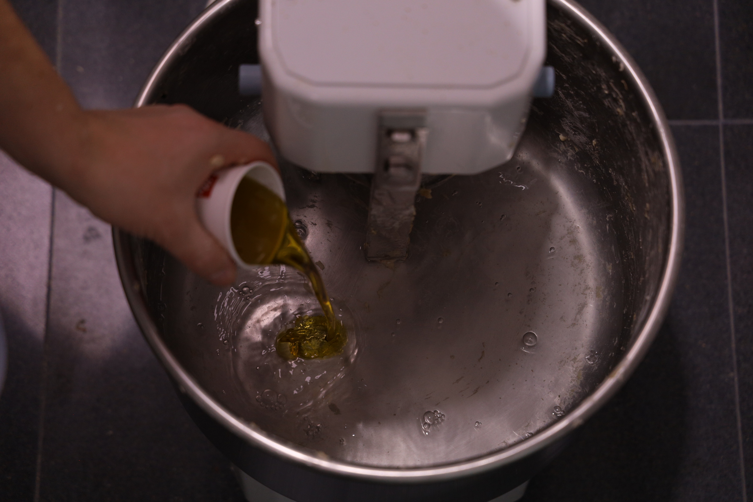 Place all the ingredients in the bowl of a spiral mixer, starting with the liquids.