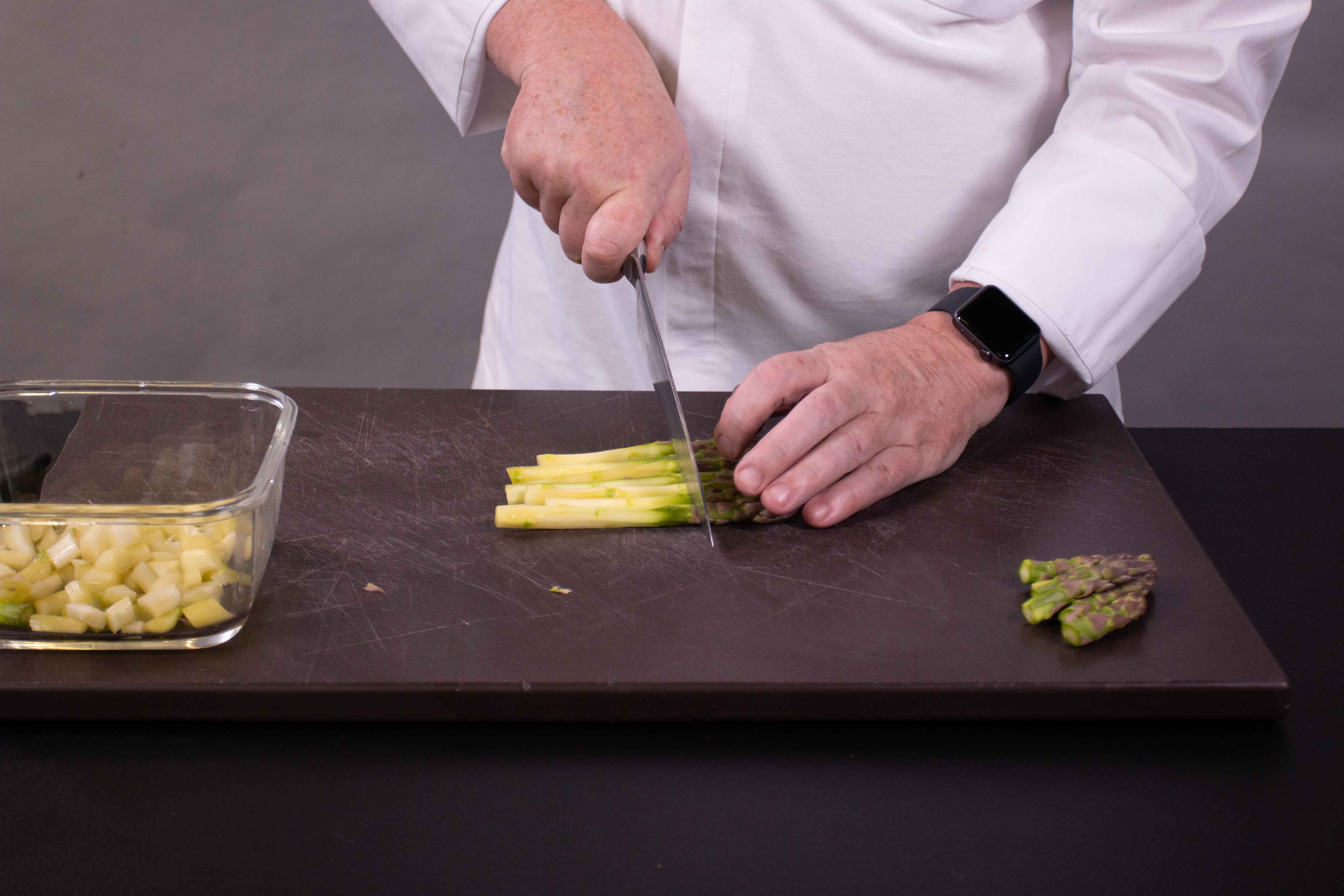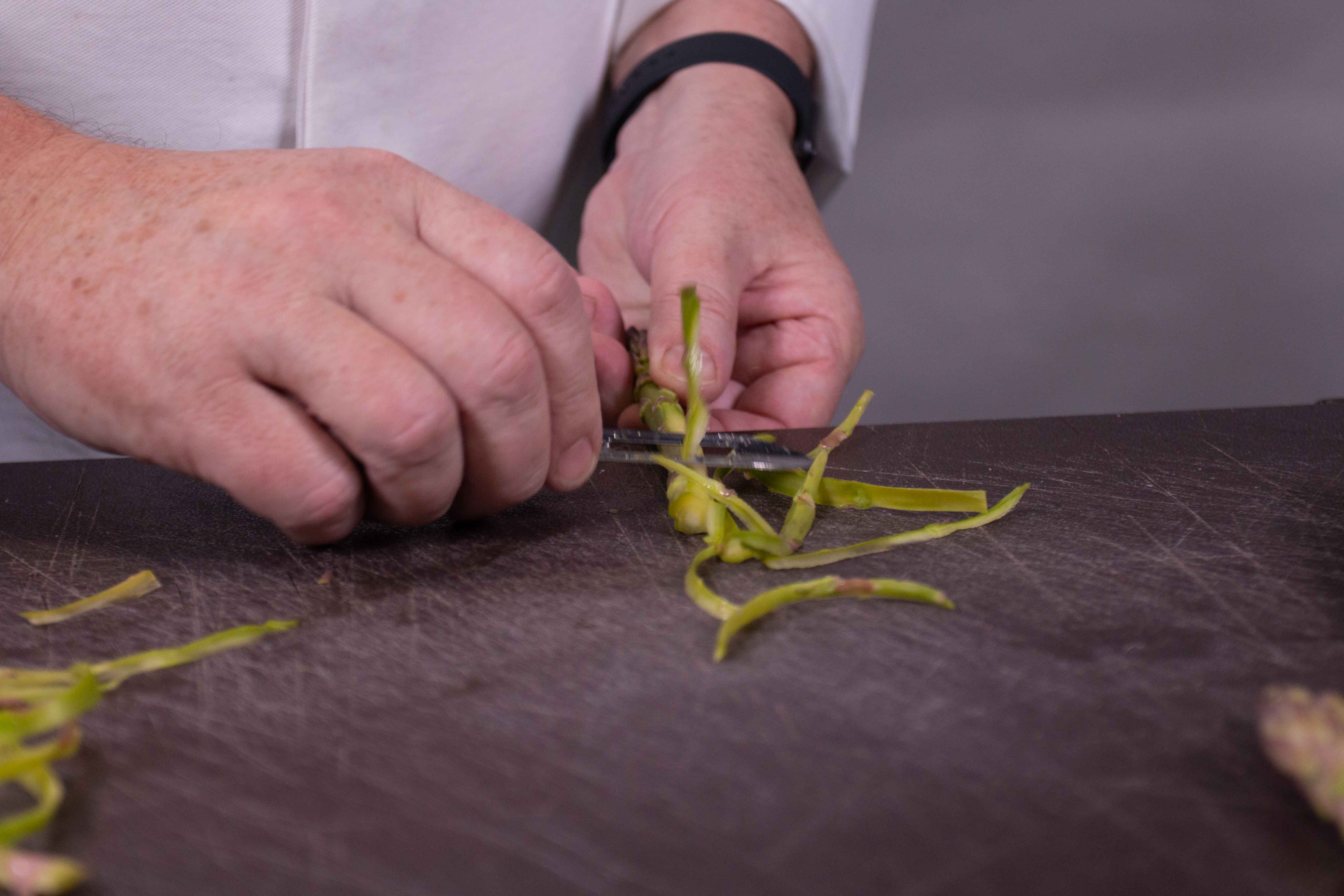 The remaining asparagus will be served raw and cut into thin shavings using a mandolin.